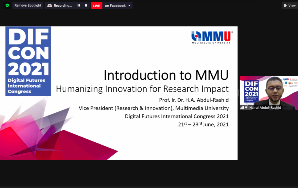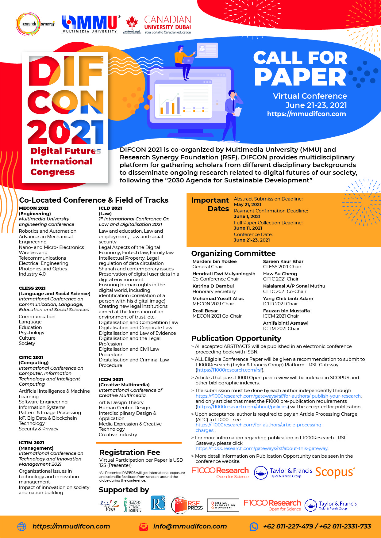 Digital Futures International Congress (DIFCON 2021) is co-organized by Multimedia University (MMU), Research Synergy Foundation (RSF), and Canadian University, Dubai (CUD). DIFCON provides a multidisciplinary platform for gathering scholars from different disciplinary backgrounds to disseminate ongoing research related to digital futures of our society, following the “2030 Agenda for Sustainable Development”.